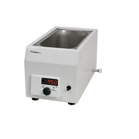 Banho de aquecimento com corpo metálico e pintura em epóxi eletrostática, cuba em aço inoxidável 304 sem emendas com cantos arredondados, controle de temperatura digital e plataforma interna.